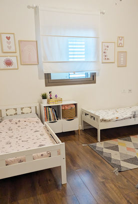 בזמנים שלנו גם הממ'ד דורש התייחסות מיוחדת, במיוחד אם אנחנו מעבירים לשם את הילדים לישון. אז הממד המחסני המוזנח הפך לחדר אחיות מושלם! עם קשתות על הקירות בצבעי פסטל נעימים, ריהוט תואם לכל אחות כדי ליצור להן גם מקום פרטי ואישי לכל אחת ויחד הן חולקות מרחב לקריאה ואיפור כיפי. הריהוט הותאם בדיוק עבור צרכי הבנות והצבעים נבחרו יחד איתם בשיתוף פעולה מתוק במיוחד.